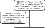 As compared with C-LCIS, which is almost always hormone receptor (HR)-positive and human epidermal growth factor receptor 2 (HER2)-negative, LCIS variants show greater variability in receptor expression, with estrogen receptor (ER)-negativity in up to 50% and HER2-positivity in up to 30% [15]. P-LCIS is more likely to present as a targeted radiologic lesion, either calcifications or rarely a mass-forming lesion, and is associated with significantly higher upgrade rates on surgical excision than C-LCIS (25–40% [16,17,18,19] versus <5% [20,21,22,23]). However, little is known regarding the natural history of these LCIS variants [12, 24,25,26,27] due to their rarity and the historical tendency to treat them as DCIS, leading to controversy regarding their management, in particular whether they should be managed similar to C-LCIS or DCIS.