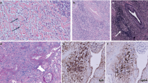 We observed IgG4-positive plasma cells in 131 specimens (79%) with a median of 14 IgG4-positive plasma cells/HPF (range 1–344 IgG4-positive plasma cells/HPF). Table 2 summarizes the distribution of IgG4-positive plasma cell infiltrates in the three groups. A total of 19 specimens exhibited ≥70 IgG4-positive plasma cells/ HPF (range 72–344 IgG4-positive plasma cells/HPF) and were classified as IgG4-positive. Four (21%) of the IgG4-positive specimens had an IgG4/IgG plasma cell ratio >40%. Table 3 and Fig. 3 summarize the immunohistochemical, histopathological, and clinical features of the IgG4-positive specimens.