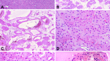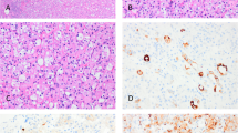 Oncocytic renal tumors in a younger patient, particularly with a history/family history of prior pheochromocytoma or gastric GIST, requires careful search for the presence of intracytoplasmic pale eosinophilic to clear inclusions that may suggest a SDH-deficient tumor. “SDH-deficient RCC” mostly show low-grade cytology with only mild nuclear atypia, cells with abundant eosinophilic, granular cytoplasm, usually nested growth pattern, and frequently the presence of one or more pale eosinophilic or flocculent to completely clear cytoplasmic inclusions (Fig. 4A). These inclusions correspond to giant mitochondria by ultrastructural examination. The presence of such findings, even when focal, will need immunohistochemical staining for SDHB38,42,43. Occasional SDH-deficient tumors may show focal, dominant, or even exclusive high-grade cytology. The cytoplasmic inclusions are seen even in such high-grade areas, although the finding may be only focal42,44,45,46. SDHB immunohistochemical staining is now available in many pathology laboratories, but if not available in-house, it may be prudent to send the case out for staining by a reference laboratory. Since SDHB is localized to mitochondria, positive/retained immunohistochemistry always shows granular cytoplasmic positivity. Weak, non-granular, diffuse cytoplasmic positivity is not regarded as retained reactivity44. Patients with SDH-deficient RCC are most often (75%) associated with mutation in SDHB, although rare cases with mutations in SDHD, SDHC and SHDA are described. In general, SDHB staining is lost in tumors with underlying mutations in any of these genes, while retained expression is seen in the internal control tissues (e.g., endothelial cells and inflammatory cells, Fig. 4B)45,46,47,48,49,50.