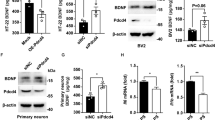 a Representative photomicrographs of dendritic spines from DG granular cells, scale bar, 10 μm. b Spine density in dendrites of DG granular cells in Pdcd4 KO and WT mice. n = 4 per group; mean ± SEM, two-way ANOVA and Sidak’s multiple comparison test, *P < 0.05, **P < 0.01 vs. the No-CRS group; #P < 0.05, ##P < 0.01 vs. the CRS-WT group. c Representative images of high-magnification z-stack projections of segments of the DG dendrites (scale bar, 5 µm). Mean ± SEM of spine density from control (n = 36 from four mice), OE-Pdcd4 (n = 46 from four mice). *P < 0.05 relative to control mice (unpaired two-tailed Student’s t test). d Mice hippocampus BDNF was detected by ELISA. n = 6–7 per group, Rapamycin (Rapa), mean ± SEM, unpaired two-tailed Student’s t test, *P < 0.05. e Representative photomicrographs of dendritic spines from DG granular cells, scale bar, 10 μm. f Spine density in dendrites of DG granular cells. n = 4 per group; mean ± SEM, unpaired two-tailed Student’s t test, *P < 0.05. g Quantitative RT-PCR analysis of BDNF mRNA expression in the hippocampus in Pdcd4 KO and WT mice. n = 6–7 per group; mean ± SEM, two-way ANOVA (WT vs. KO, F1,22 = 10.97, P < 0.01; No-CRS vs. CRS, F1,22 = 11.67, P < 0.01; interaction, F1,22 = 0.846, P = 0.3676) and Sidak’s multiple comparison test, *P < 0.05. h Quantitative ELISA analysis of pan-BDNF protein expression in the hippocampus in Pdcd4 KO and WT mice. n = 6 per group; mean ± SEM, two-way ANOVA (WT vs. KO F1,20 = 6.141, P < 0.05; No-CRS vs. CRS, F1,20 = 6.906, P < 0.05; interaction, F1,20 = 2.816, P = 0.1089) and Sidak’s multiple comparison test, *P < 0.05. i Quantitative ELISA analysis of pan-BDNF protein expression in the hippocampus in OE-Pdcd4 and Control mice. n = 6 per group; mean ± SEM, unpaired two-tailed Student’s t test, *P < 0.05 vs. the control group.