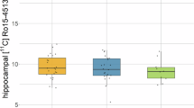 Statistical analyses were performed with SPSS version 20 (IBM, Armonk, NY) for MAC OS X. The data distribution of all variables was tested using Kolmogorov–Smirnov tests and Grubbs test was used to determine if there were outlying data. Since all data were normally distributed, parametric tests were used. To test our primary hypothesis that GABA-A receptor availability would be altered in patients, an independent samples t-test was used to investigate if there were group differences in the VT of [11C]Ro15-4513 in the hippocampus in (1) medicated patients relative to age-matched healthy controls and (2) antipsychotic-free patients relative to age-matched healthy volunteers. Independent samples t-tests were also used to investigate group differences in sociodemographic and clinical data. There was an outlier in the medicated patient group with high VT values in the hippocampus (Grubbs test p < 0.05) and these data were excluded from further analysis. To determine whether there was an effect of group on VT values in our exploratory analyses of other brain regions, we performed a two-way ANOVA with VT as the dependent variable and group (patient or control) and brain region as the independent variables. Exploratory analyses were also used to investigate the association between [11C]Ro15-4513 and clinical data using Pearson’s product moment correlation. All data are presented as mean ± SD, and the α level was set for all comparisons at p < 0.05, corrected.