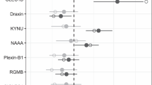 Protein concentrations in CSF were measured using multiplex immunoassays based on proximity extension assay (PEA) technology (Olink® Proteomics, Uppsala, Sweden), which has been described in detail elsewhere [19]. Briefly, the PEA method includes oligonucleotide-labeled antibodies that bind to the target protein. This process is coupled with a qPCR readout, which enables a multiplex setup with low cross-reactivity [19]. For this study, we assessed a broad set of proteins using three Olink Multiplex panels: Inflammation I, Oncology I, and Cardiovascular I. Combined, these panels include 201 unique protein assays. Six assays overlapped with a previous study conducted in the same study population [7]. Correlations for the overlapping assays are presented in Supplementary figure 1 and case-control comparisons for these proteins are shown in supplementary table 1. Analyses, initial preprocessing, and quality control were performed at the Clinical Biomarker Facility at SciLifeLab Uppsala, Sweden (SBP-S) and at Olink Bioscience Uppsala, Sweden (SBP-G). Samples from the SBP-S were analyzed on three plates and samples from the SBP-G on two plates. Samples from patients and controls were evenly distributed across the plates. Protein concentrations were represented by NPX (normalized protein expression) values on an arbitrary log2-scale [19]. Brain-derived neurotrophic factor (BDNF) was excluded in both cohorts due to technical issues. No samples failed the initial quality control in either cohort. The staff performing the analyses were blinded to all phenotype information. After data delivery, we performed additional preprocessing and quality control steps. The NPX values were median-centered per protein and plate to adjust for batch effect, and subsequently autoscaled using the standard deviation as the scaling factor [20]. Sample quality was checked using principal component analyses and by comparing protein concentrations for panel-overlapping assays. No samples failed this quality control.