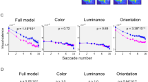 The details of saliency map computations have already been described largely elsewhere (Figure S1 in Yoshida et al. [19]). To examine salience-guided eye movements, we used a validated computational model of visual attention and compared it with individual eye movements. The saliency maps for the test images were computed with the Itti–Koch’ standard saliency model for static images [15] implemented in the Graph-Based Visual Saliency (GBVS) toolbox for MATLAB [34]. The Itti–Koch model is a neurobiologically inspired model that computes visual salience at each location within the images derived from low-level image features. The net saliency map (referred to as the full model) was defined as the map that summed the saliency maps of the three low-level features with equal weights. Note that the saliency maps were created based purely on raw visual information. We evaluated the contribution of the full model and low-level visual features using the net saliency map and single-feature saliency maps, respectively. For each test image, we obtained a saliency map of 80 × 64 pixels. To treat the saliency maps as density maps, all the maps were normalized so that the sum of the saliency values of all the pixels was one. For each model of saliency map (full, color, luminance, and orientation models) of an image, the mean salience values at the endpoints of saccade made during presentation of the image were calculated. Then, the mean salience values for each model of saliency map were further averaged over the different images, referred to as the “salience score” for each model of saliency map. Thus, the salience score represented the mean saliency at the gazes of the participant. Sixteen of the 20 images were used for analysis, excluding those in the noise category since they had no color contrast. A schematic diagram of the quantification and salience scores for the full model of the 1012 individuals are shown in Fig. 1A, B, respectively. These analyses were carried out using MATLAB (MathWorks, NY). Code availability: the scripts used in the analysis will be available on reasonable request.
