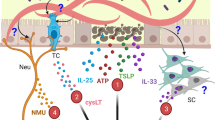 An important feature of the host response to helminth infection is that the magnitude of inflammation and activation of immune cells must be tightly regulated to enable efficient killing and removal of harmful levels of parasites and their products, whilst not going overboard and limiting host tissue damage. This is true for the induction and regulation of Type 2 immune responses, as well as Type 1 immune responses. Several factors have been shown able to dampen Type 2 immune responses, like IL-10, TGFβ, IL-13 decoy receptor (IL-13Rα2), and RELMα. Goblet cells and tuft cells express CRTH2, the receptor for prostaglandin D2 (PGD2). Prostaglandins are eicosanoids, bioactive lipids with pro- and anti-inflammatory activity, derived from arachidonic acid27,182. The pro-inflammatory role of PGD2 has been shown in the lungs, and intestinal tuft cells have the potential to produce PGD2 with the possibility to be involved in anti-helminth immunity. Oyesola et al. showed that in the intestine the PGD2-CRTH2 pathway limited Type 2 immune responses. Mice lacking CRTH2 showed enhanced N. brasiliensis clearance which was associated with increased goblet cell hyperplasia, indicating a novel role for PGD2-CRTH2 pathway in influencing epithelial cells responses during type 2 immunity183. As mentioned in the previous section on helminth induced lung immune responses, neurotransmitters and neuropeptides have been shown able to induce and regulate type 2 immune responses. The intestinal environment is highly innervated, and several immune cells are co-localized with enteric neurons184. A typical example is the subset of enteric neurons which express NMU and co-localize with ILC2s, providing a rapid activator of ILC2s and promoting intestinal type 2 immune responses26,31 (Fig. 4). In contrast to NMU, the β2-adrenergic receptor (β2AR) pathway has been shown to downregulate Type 2 immune responses. ILC2s express β2AR, and deficiency of β2AR in mice enhanced type 2 immune responses but did not affect ILC2 development185. Increased eosinophilia and goblet cells hyperplasia were observed following N. brasiliensis infection in β2AR-deficient mice, with enhanced worm expulsion185. These findings indicate that the nervous system has evolved adrenergic and cholinergic neurons that respectively downregulate and activate intestinal ILC2s26,31,185, and have the potential to play an important role in inflammatory responses and tissue repair during both helminth infection and host immunopathologic diseases. Another consideration is the important role enteric neurons play in regulating homeostatic and physiological mechanisms in the intestine (e.g. intestinal motility). Enteric neurons need to be protected from damage due to their reduced proliferation and regeneration capacity with Ahrends et al. recently identifying that IL-4 and IL-13 produced during S. venezuelensis infection were required to induce neuroprotection. Helminth-induced neuroprotection was dependent on IL-5-mediated recruitment of duodenal eosinophils, and their IL-4/IL-13 production186. Long-term neuroprotection was induced due to modification in the progenitor compartments in the bone marrow after S. venezuelensis infection. This study identified a novel role for eosinophil-derived IL-4 and IL-13 in intestinal neuroprotection186. In addition, a recent study by Progatzky et al. described a novel role for IFNγ in promoting homeostasis and tissue repair after intestinal damage by H. polygyrus infection, highlighting the role of enteric glial cells (EGCs) in immunity and repair187. Disrupting the IFNs pathway increased eosinophils, neutrophils, and monocytes inflammation, which was associated with a delay in granulomas resolution. The authors identified that EGCs produced CXCL10, which was required for tissue repair after infection187.
