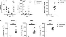 Additionally, C57BL/6J WT (Stock No: 000664-JAX) and IFNαβR−/− (Stock No: 32045-JAX) mice were both originally purchased from Jackson Laboratories, and Ifnlr1−/−81 mice on a C57BL/6J genetic background were bred at the Biomedical Research Foundation Academy of Athens (BRFAA) animal house, and their pups were obtained by timed mating. IFNαβR−/− Ifnlr1−/− double knock-out animals were generated by breeding IFNαβR−/− and Ifnlr1−/− until double knock-outs were achieved20. All mice were housed in specific-pathogen free (SPF) conditions in full compliance with Federation of Laboratory Animal Science Associations (FELASA) recommendations. All procedures had received approval from Institutional and Regional Ethical Review Boards. Three-day-old neonatal mice were infected intranasally (i.n.) with 3 pfu of influenza virus H1N1 strain PR8 (A/Puerto Rico/8/34) (Charles River Laboratories) in 5 µl volume under inhaled isoflurane anesthesia. Infectious viral load was determined by plaque assay of the titrated viral stock on MDCK cells.