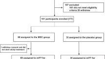 The UC-MSCs were manufactured by Vcanbio Cell & Gene Engineering Ltd., (Tianjin, China) in a GMP facility, which had been approved by the authorities. Briefly, the Wharton’s jelly from umbilical cord tissue was diced into cubes in ~2 mm3, and seeded into a T75-cm2 tissue culture flask with MSCs culture medium. The adherent cells were digested and re-plated for expansion to master cell bank at passage 2. In the next step, cells were thawed and expended with serum-free medium. Finally the homogenous population of these cultured cells at passage 5 were collected as mentioned,28 and used for all experiments. The collected cells were identified to meet the minimal criteria of MSCs according to ISCT (International Society of Cell Therapy) standard.29 The quality and viability of these cells was reconfirmed after preparation and before each infusion for patient. MSCs are characterized by a fibroblast-like morphology, and by expression of cell surface markers including CD19, CD34, CD11b, CD45, CD73, CD105, CD90, and HLA-DR, and with potential to differentiate into osteoblasts, adipocytes, and chondroblasts (Supplementary Figs. 3 and 4). The treatment group received three cycles of intravenous infusion of allogeneic UC-MSCs (3 × 107 cells each infusion) on days 0, 3, and 6. The total volume of the UC-MSCs infusion was 60 ml.