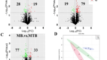The TB2 and TB0 groups can be distinguished by scatter plots of the OPLS-DA model (Fig. 2a). The verification results of the permutation test to the model showed that R2X was 0.515, R2Y was 0.840, and Q2 was 0.572 (P < 0.005) (Fig. 2b). The TB6 and TB2 groups can also be distinguished by scatter plots of the OPLS-DA model (Fig. 2c). The permutation test of the model showed that R2X was 0.529, R2Y was 0.892, and Q2 was 0.364(P < 0.005) (Fig. 2d). Furthermore, 25 lipid metabolites with a significant statistical difference were commonly identified as the differential metabolites by the comparison both between the TB0 group and TB2 group, and TB2 group and TB6 group (Fig. 2e).