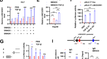 Given that the TGF-β/SMAD signaling plays essential roles in cell proliferation, apoptosis, and metastasis, the function of the TGF-β/SMAD-lnc-UTGF positive feedback loop was elucidated. As shown, neither silencing lnc-UTGF nor overexpressing lnc-UTGF affected cell viability or apoptosis (Supplementary Fig. S11a–d). Moreover, lnc-UTGF did not influence the colony formation of hepatoma cells (Supplementary Fig. S11e, f), indicating that lnc-UTGF may not significantly affect tumor cell growth. Subsequent analysis detected lnc-UTGF at a low level in cell lines with low metastatic potential (L02, HepG2) and at a higher level in those with high metastatic activity (SK-HEP-1, MHCC97H, SNU-449) (Supplementary Fig. S12). Further in vitro transwell assays revealed that the migration and invasion abilities were significantly inhibited in the hepatoma cells with siRNA targeting lnc-UTGF (Fig. 6a, b; Supplementary Fig. S13a, b), with heterozygous knockout (Fig. 6c; Supplementary Fig. S13c) or stable knockdown of lnc-UTGF (Supplementary Fig. S13d, e). And silencing lnc-UTGF also attenuated the TGF-β-stimulated migration of hepatoma cells (Fig. 6d; Supplementary Fig. S13f). On the other hand, ectopic expression of lnc-UTGF increased the migration and invasion of cells without or with TGF-β treatment (Fig. 6e–g, Supplementary Fig. S14a-c), whereas this promoting effect of lnc-UTGF was attenuated when SMAD2/4 were knocked down (Fig. 6g, Supplementary Fig. S14c). Notably, mutations in the SMAD2/4-binding sites abrogated the role of lnc-UTGF in promoting migration of hepatoma cells (Fig. 6h, Supplementary Fig. S14d), suggesting that lnc-UTGF may promote migration/invasion via SMAD2/4. We then analyzed the well-recognized TGF-β downstream genes involved in the regulation of cell proliferation (c-Myc, CDKN1A), apoptosis (BIM and DAPK), and metastasis (SNAIL1, MMP2). In agreement with the phenotype observations, TGF-β or siUTGF did not affect the mRNA levels of c-Myc, CDKN1A, BIM, and DAPK in our cell models (Supplementary Fig. S15a, b), whereas the expressions of SNAIL1 and MMP2 were significantly enhanced upon TGF-β stimulation, and this stimulatory effect was attenuated by knocking down lnc-UTGF (Supplementary Fig. S15c). Consistently, ectopic expression of lnc-UTGF increased the mRNA levels of SNAIL1 and MMP2 (Supplementary Fig. S15d).