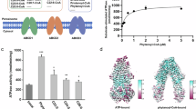 Structural comparison of the two NBDs in the C26:0-bound structure revealed that the end of the C-terminal coiled coil from one subunit interacted differently with the other NBD. In one NBD, the E722 from the coil helix was positioned closely to the P508 from the Walker A motif (Supplementary Fig. 7b, c), whereas the E722 in the other subunit moved away from residue P508. The sequence of the Walker A motif (GPNGCGKSS, Supplementary Figs. 1 and 9g) was conserved among ABCD1, ABCD2, and ABCD3 but different from that of ABCD4. Furthermore, an ATP molecule that binds to the Walker A motif of the same NBD was defined in the C26:0-CoA bound structure (Supplementary Fig. 9b), in which E722 made close contact with P508. The ATPase activity of P508A mutant was lower than that of wild-type ABCD1 (Supplementary Fig. 2c), indicating that P508 plays a role in regulating ATP hydrolysis. Furthermore, we measured the transporter ATPase activity using the C-terminus truncation mutant ABCD1 (ΔC 686–745) to confirm the role of the C-terminal coiled coil. This mutant increased the basal ATPase activity by almost one-fold compared with that of the wild-type ABCD1 (Fig. 1h).