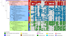 DNA was extracted from 310 samples of Costa Rican methane seep sediments and seep carbonates (Supplementary Table 1) using the Qiagen PowerSoil DNA Isolation Kit 12888 following manufacturer directions modified for sediment and carbonate samples [21, 49]. The V4-V5 region of the 16S rRNA gene was amplified using archaeal/bacterial primers, 515 F (5′-GTGYCAGCMGCCGCGGTAA-3′) and 926 R (5′-CCGYCAATTYMTTTRAGTTT-3′) with Illumina adapters [50]. PCR reaction mix was set up in duplicate for each sample with New England Biolabs Q5 Hot Start High-Fidelity 2x Master Mix in a 15 µL reaction volume with annealing conditions of 54 °C for 30 cycles. Duplicate PCR samples were then pooled and 2.5 µL of each product was barcoded with Illumina NexteraXT index 2 Primers that include unique 8-bp barcodes. Amplification with barcoded primers used annealing conditions of 66 °C and 10 cycles. Barcoded samples were combined into a single tube and purified with Qiagen PCR Purification Kit 28104 before submission to Laragen (Culver City, CA, USA) for 2 × 250 bp paired-end analysis on Illumina’s MiSeq platform. Sequence data were submitted to the NCBI Sequence Read Archive as Bioproject PRJNA623020. Sequence data were processed in QIIME version 1.8.0 [51] following Mason et al. [52]. Sequences were clustered into de novo operational taxonomic units (OTUs) with 99% similarity [53], and taxonomy was assigned using the SILVA 119 database [54], which uses NCBI rather than GTDB taxonomy. Known contaminants in PCR reagents as determined by analysis of negative controls run with each MiSeq set were also removed (see Supplementary Materials and Methods) along with rare OTUs not present in any given library at a level of at least 10 reads. The produced table of OTUs detected in the 310 methane seep sediment and seep carbonate amplicon libraries was analyzed using the correlation algorithm SparCC [41].