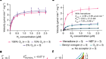 Atmospheric H2 was measured on a CompactGC (Global Analyser Solutions, Breda, The Netherlands) with a pulsed discharge ionization detector with an input range of 8 nA. One hundred twenty milliliters serum bottles containing 10 mL cell suspension (OD600 = 0.12) were used, capped with a rubber stopper. The heat-killed control was autoclaved at 121 °C for 15 min. The bottles were made anoxic by flushing with N2, after which 1 mL O2 and 3 mL CO2 were added to the headspace. H2 was added from a stock diluted in N2 to obtain trace concentrations. To test whether the purified Hyd-1h could oxidize atmospheric H2, 120 serum bottles were filled with 5 mL 50 mM KPi (pH 7.0), 500 µM nitroblue tetrazolium. 0.3 mg mL−1 bovine serum albumin was present in the bottles to create a stable protein environment. The bottles were made anoxic by flushing with N2. The assay was initiated by addition of 30 µg purified hydrogenase. Bottles containing cells or pure enzyme were incubated at 55 and 40 °C, respectively, at 300 rpm. Biological triplicates were used and for each data point 0.2 mL headspace was sampled.