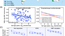 The diversity of soil bacteria and fungi was analyzed through amplicon sequencing (Illumina MiSeq). A total of 10 g of frozen soil samples were cooled using liquid nitrogen and ground using a mortar and pestle. Soil DNA (n = 435) was extracted using a DNA Isolation Kit (Powersoil, MoBio Laboratories, Carlsbad, CA, USA). A portion of the bacterial 16S and eukaryotic 18S rRNA genes were sequenced using the 515F/806R and Euk1391f/EukBr primer sets [45, 46], respectively. Analyses of bioinformatics were carried out with QIIME [47], USEARCH [48], and UNOISE3 [48]. Phylotypes (i.e., Amplicon Sequencing Variants, ASVs) were identified at the 100% identity level. The ASV abundance tables were rarefied at 5000 (bacteria via 16S rRNA gene) and 2000 (fungi via 18S rRNA gene), respectively to ensure even sampling depth. The diversity (richness) of soil bacteria and fungi was determined from rarefied ASV abundance tables. Before conducting statistical modeling, we also ensured that our choice of rarefaction level, taken to maximize the number of samples in our study, was not obscuring our results [37]. Rarefaction curves are showed in Fig. S2. Before conducting statistical modeling, we ensured that our choice of rarefaction level, taken to maximize the number of samples in our study, was not obscuring our results. Thus, using the samples with the highest sequence/sample yield, we tested for the impact of different levels of rarefaction on belowground diversity. Importantly, we found highly statistically significant correlations between the diversities and community compositions of soil bacteria (rarefied at 5000 vs. 18,000 sequences/sample) and fungi (rarefied at 2000 vs. 10,000 sequences/sample), providing evidence that our choice of rarefaction level did not affect our results or conclusions (r > 0.98; p < 0.001 in all cases). Microbial diversity data, but not PLFA results, were utilized in an earlier study aiming to study the evolution of soil microbial communities in global chronosequences [37].