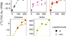 Lipid-SIP is highly sensitive to quantify low amounts of assimilated carbon, thereby facilitating the identification of microorganisms and the detection of lipid biosynthetic pathways [42, 43]. Total lipids were extracted from the freeze-dried sediments of SIP samples (~3 g) using a modified Bligh-Dyer protocol [44]. In brief, a mixture of methanol, dichloromethane and twice phosphate and twice trichloroacetic acid buffer were used for extraction by sonication for 10 min. The combined lipid extracts were washed 3 times with water to remove the remaining buffer. Finally, the total lipid extract (TLE) was evaporated under a stream of nitrogen. The isoprenoidal derivatives of diether and tetraether lipids (i.e. phytane and biphytanes) were obtained from the TLE using ether-cleavage [45]. In brief, 300 µl BBr3 was added to the TLE under an argon atmosphere in glass vials, which were sealed and heated to 60 °C for 2 h. After reaction, 1 ml lithium triethylborohydride in tetrahydrofuran (1.0 M; Sigma Aldrich) was added in order to reduce bromides to hydrocarbons. Phytane and biphytanes were quantified by gas chromatrogaphy - flame ionization detection (GC-FID; Thermo Finnigan, Bremen Germany), followed by 13C composition measurements using a GC-isotope ratio mass spectrometer (IRMS) consisting of a Thermo Scientific Trace GC equipped with a Restek Rxi-5 ms column (30 m × 250 µm × 0.25 µm; Restek, Bad Homburg, Germany) and coupled via a GC Isolink interface to a DELTA V Plus IRMS system (Thermo Scientific, Bremen Germany). Temperature settings were as follows: initial oven temperature at 60 °C for 1 min, increase to 150 °C at a rate of 10 °C/min, increase to 310 °C at a rate of 4 °C/min, hold at 310 °C for 40 min; injector temperature 290 °C; oxidation reactor of the combustion interface 1000 °C. Isotopic values are reported in the delta notation as δ13C (‰) relative to the Vienna PeeDee Belemnite (VPDB) standard. The 1σ precision of repeated isotopic analysis (n = 2) based on the internal standard (tetracontane) was less than 1‰.