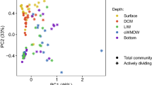 During a cruise across the Pacific Ocean from New Zealand to Alaska we carried out mesocosm experiments in three biogeographic provinces, SPSG, PNEQ and NPPF, to test for the effect of B12 and α-ribazole on growth and related changes in microbial community composition (Fig. 1B). These biogeographic provinces differ greatly regarding hydrographic, biogeochemical, biotic and microbial features [33, 34]. SPSG encompasses the most oligotrophic and permanently stratified region of the Pacific Ocean with water temperatures of 26°–30 °C. In the upper 100 m, we encountered nitrate concentrations close to or below the detection limit (0.3 µM), concentrations of chlorophyll a below 0.35 µg l−1, except at the deep chlorophyll maximum (DCM) around 90 m depth, and rates of HPP not exceeding 30 ng C l−1 h−1. PNEQ adjacent to the equatorial upwelling is more productive. The upper 100 m are as warm as SPSG and concentrations of inorganic nutrients, chlorophyll a, POC and rates of HPP were also low in the upper 40 m but increased at 60 m and below. At these depths, inorganic phosphate concentrations reached 0.23 µM, well above the detection limit of 0.04 µM, and HPP 382 ng C l−1 h−1. Chlorophyll a concentrations remained as low as in SPSG with a maximum at the DCM at 105 m. Prokaryotic cell numbers were also as low as in SPSG, but bulk growth rates were much higher and reached 0.71 d−1, reflecting the metabolically highly active heterotrophic prokaryotic communities. The cold and nutrient-rich NPPF exhibited highest concentrations of chlorophyll a of 0.7–1.1 µg l−1 and highest numbers of prokaryotes (up to 1.8 106 cells ml−1) but lower rates of HPP than in PNEQ, 90–140 µg C l−1 h−1. Highest values consistently occurred at 20 m depth and continuously decreased below. Further details of the biogeochemical and microbial features of these provinces, stations and depths of sampling are published elsewhere [33, 34] and shown in Table 1.