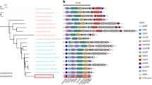 The genomes were grouped using principle coordinates analysis based on KEGG/SEED gene presence/absence (Table S3). The first principle coordinate explains 37% of the variation, but does not separate these genomes by salinity preference (Fig. 2). Instead, cluster 5 picocyanobacteria grouped together at the right side of the ordination, slightly separated from Ca. Synechococcus spongiarum and Prochlorococcus, whilst to the left were other unicellular cyanobacteria comprising S. elongatus, other Synechococcus-like isolates as well as members of the genera Microcystis, Synechocystis, Crocosphaera and Cyanothece. To understand which genes drive the clear separation among the cyanobacteria, we compared the eigenvalues of each gene that correlated with the first principle coordinate. We found that virtually all of the high scoring genes (top-20 Eigenvalues) were involved in the formation of carboxysomes as well as RuBisCO components (Table S4). Beyond this, genomes tended to group by salinity or thermal tolerance. Thus, this analysis reinforces the classical separation of cyanobacteria into α- or β-cyanobacteria [7, 17, 18, 26], and led us to analyze in detail the composition and genomic context of carboxysome, RuBisCO and CCM components in these newly sequenced freshwater isolates as well as their marine/brackish cluster 5 relatives compared to their most immediate but distantly related Synechococcus-like freshwater relatives.