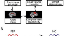 Notably, FEM patients also showed reduced functional connectivity in the dorsal corticostriatal system at baseline. We have observed a similar gradient of dorsal-to-ventral, hypoconnectivity-to-hyperconnectivity in a separate sample of patients with first episode schizophrenia-like psychosis and their unaffected relatives38. We have also found hypoconnectivity of the dorsal system in people with an at-risk mental state for psychosis59. Most patients in this study had experienced an episode of psychosis, suggesting that dorsal corticostriatal hypoconnectivity may be a risk marker for psychosis that transcends traditional diagnostic boundaries. Further work examining how corticostriatal connectivity covaries with specific symptoms or syndromes across diagnoses will be required to test this hypothesis.