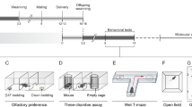 To generate the F1 offspring, female mice were fed either a HFD (Kliba-Nafag 2127, Kaiseraugst, Switzerland; 60% energy from fat; major nutrients: 23.9% crude protein, dry matter 92%, crude fat 35%, 23.2% NFE) or normal laboratory chow (Kliba-Nafag 3430) for a total of 9 weeks: 3 weeks prior to mating, 3 weeks during gestation and 3 weeks during lactation14,25. Dams exposed to 9 weeks maternal HFD were not obese at the time of mating nor did they develop obesity or any altered metabolic phenotype as well as changes in maternal care during gestation and lactation14. Upon weaning on postnatal day (PND) 21 all the offspring were given ad libitum access to chow diet. To generate the F2 offspring, F1 males born to HFD exposed dams and chow fed dams were mated with naïve primiparous female mice reared on chow diet. The males were kept in the mating cage for 3–4 h until a vaginal copulation plug was confirmed. Pregnant dams from both groups were exposed exclusively to chow diet throughout gestation and lactation. Similarly, to generate the F3 offspring, F2 males from HFD and chow fed ancestors were mated with naïve primiparous females (Fig. 1). One offspring per litter from ten different dams was selected for hedonic, metabolic, neuroanatomical, and neurochemical tests to control for litter effect. Behaviorally naïve offspring were allocated for each experiment to avoid the possible effects of prior behavior testing. Both male and female offspring were included in order to assess potential sex-specific effects26. The groups were defined as HFD and control (CTR) in both F2 and F3 generations where offspring from HFD fed ancestors belong to the HFD group and offspring from chow fed ancestors belong to the CTR group. The experiments and evaluations commenced when offspring reached adulthood at PND 70.