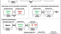 Functional MRIs were conducted on a 3.0 T GE Signa HDx scanner and an eight-channel head coil, using an echo planar imaging protocol. We collected 120 T2*-weighted functional volumes in each task run, with three dummy scans collected prior to the sequence to ensure magnetisation had stabilised to a steady state. Each volume consisted of 40 axial slices parallel to the intercommissural line, with 3.5 mm thickness, 2.5 s TR, 27.5 TE, and 90° flip angle. The field of view was 24 × 24 cm2 and the matrix size was 64 × 64. We also acquired a T1-weighted anatomical image with 1 mm3 isotropic voxel resolution to normalise the fMRI data to standard space. This was produced using a 3D spoiled gradient echo sequence in the sagittal plane with the following parameters: TR = 8.3 ms, TE = 3.2 ms, flip angle=11°, TI = 500 ms, NEX = 1, ASSET = 1.5, S/I frequency direction, 256 × 256 matrix size, and 180 contiguous 1 mm slices.