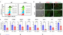 We established hiPSCs from a healthy volunteer (47-year-old male, named THC-10). T cells from peripheral blood were cultured on dishes coated with anti-human CD3 antibody (1:100, BD, Franklin Lakes, NJ, USA) in KBM502 medium (Kohjin Bio, Saitama, Japan). We confirmed that the subject did not harbor any missense variants of the genes relevant for the carbonyl stress pathway, namely, GLO1, GLO2, and AGER (encoding AGE specific receptor), as described previously26. T cells were reprogrammed to hiPSCs using CytoTune®-iPS 2.0 (ID Pharma, Tsukuba, Japan) according to the manufacturer’s instructions. The hiPSCs were maintained under feeder-free conditions using the Cellartis® DEF-CS™ 500 culture system (Takara Bio, Shiga, Japan). GLO1 deletion was generated via genome editing using the CRISPR-Cas9 system. Briefly, cultured hiPSCs were transduced with single guide RNA (5′-CTTGGTACTGGGGTCCGCGTCGG-3′), Guide-it Recombinant Cas9 protein (Takara Bio), and puromycin-resistant vector pDonor-D4 (GeneCopoeia, Rockville, MD, USA) via electroporation (Neon® Transfection system, Thermo Fisher, Waltham, MA, USA). After 24 h, puromycin (Nacalai Tesque, Kyoto, Japan) selection was performed for 24 h. Four wild type (WT) and four GLO1 KO clones were established via single-cell cloning (Fig. S1). The absence of GLO1 at the protein level was confirmed via Western blotting (Fig. 1B) using anti-rabbit GLO1 antibody (Lab-made27). A web-based tool, COSMID (https://crispr.bme.gatech.edu), was used to identify off-target sites, and two possible sites on chromosomes 5 and 7 were identified28. The genomic integrity of these regions was confirmed using the Guide-it mutation detection kit (Takara Bio). All tested clones were negative for mycoplasma. All experimental procedures were approved by the ethics committee of RIKEN (approval no. Wako 3 2019-2). All methods were conducted according to the principles set out in the WMA Declaration of Helsinki and the NIH Belmont Report. The subject provided informed and written consent for participation in the study.
