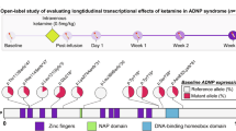 Comparing transcriptional signatures between responders and non-responders at baseline identified the upregulation of the metabotropic glutamate receptor gene GRM2 and the ionotropic glutamate receptor gene GRIN2D in blood. Both receptors have been previously implicated in ketamine’s antidepressant mechanism of action [52, 53]. The precise mechanisms underlying ketamine’s antidepressant response is still largely unknown, but studies have implicated NMDAR antagonism, glutamate surge, and α-amino-3-hydroxy-5-methyl-4-isoxazole propionic acid (AMPA) receptor activation as candidate mechanisms, among others [54]. Preclinical data provide evidence that ketamine and its metabolites may enhance synaptic activity via a glutamate-associated pathway [12] that is modulated by the actions of group II metabotropic glutamate receptors subtypes 2 and 3 (mGlu2/3), encoded by GRM2 [12]. Less data are available regarding the relationship between GRIN2D and ketamine. The GRIN2D gene encodes for the 2D subunit of the NMDAR receptor (GluN2D), which is highly expressed in forebrain inhibitory interneurons [55] and exhibits high affinity for ketamine [56]. It has been suggested that inhibition of GABAergic inhibitory interneurons by NMDAR may lead to the dysinhibition of glutamatergic pyramidal cells and an increase in excitatory glutamatergic neurotransmission with downstream effects on protein synthesis that could play a role in mood regulation [12]. Human evidence that ketamine can act on this subunit comes from a case report investigating a mutation in GRIN2D in a child with refractory status epilepticus reporting a dramatic electrical and clinical improvement upon treatment with ketamine [53]. Additional studies investigating the role of GRIN2D in the context of TRD and its implication for ketamine antidepressant effect are needed.