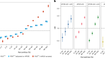 To date, genome-wide association studies (GWASs) have discovered close to 50 genome-wide significant loci (P < 5e-08) associated with LOAD risk [9, 11,12,13,14,15,16,17,18,19,20]. The ε4 allele of apolipoprotein E (APOE) is the polymorphism with the strongest effect on LOAD susceptibility [21]. Beyond APOE-ε4, there may be thousands of additional genetic polymorphisms that make small individual contributions to the overall risk for LOAD [22,23,24,25]. A polygenic risk score (PRS) [26] can be derived by summing the weighted effect of SNPs to identify a single genetic risk variable that reflects one’s relative susceptibility to LOAD. Recent LOAD PRSs capture most of the SNP heritability for LOAD [9, 24, 27]. Extensive research shows that PRSs boost the accuracy of LOAD diagnosis beyond the performance of APOE [22,23,24,25], and capture LOAD phenotypic variability not explained by APOE status [28, 29].