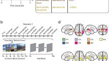 a Locations of the 14 spherical ROIs used for dynamic effective connectivity analysis, overlaid on a brain surface with lateral and ventral views. These included 2 ROIs in V1 [bilateral calcarine], 6 ROIs in VVS [bilateral inferior occipital gyrus (IOG), fusiform gyrus (FG), and inferior temporal gyrus (ITG)], and 6 ROIs in DVS [bilateral superior occipital gyrus (SOG), inferior parietal lobule (IPL), and superior parietal lobule (SPL)]. The nomenclature is based on Eickhoff-Zilles macro labels from N27, implemented in AFNI. All spheres had a radius of 5 mm and the center-of-mass coordinates obtained from the clusters are x, y and z in the MNI space. This panel was prepared using BrainNet Viewer [70]. b Diagram demonstrating the dynamic effective connectivity analysis workflow used to estimate the directional connectivity value from task fMRI data. Effective connectivity (EC) matrices, estimated for each time point, were pooled across task blocks of viewing one’s own face to derive the final EC estimate for each selected connection. *Note: Informed consent was obtained for publication of the volunteer’s photo in the figure.