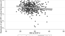 High BMI-PRS was related to differences in grey matter volume and thickness relative to age-expected values. More specifically, BMI-PRS was associated with reduced grey matter volume and cortical thickness in bilateral fronto-temporal areas. Some of these regions are associated with executive function and have long been implicated in the control of food intake and impulsivity in adults [24, 73,74,75]. Our findings raise the possibility that cognitive control and impulsivity are also implicated in childhood body weight. Indeed, changes in brain morphometry were also associated with both a composite score for executive function and personality measures of impulsivity (positive and negative urgency), while impulsivity was related to an increase in BMI SDS. The fact that the heteromodal and unimodal levels of sensory processing hierarchies were most affected by BMI-PRS is consistent with impulsive individuals exhibiting a non-normative maturation of the heteromodal regions [64, 76]. It is also in line with our previous findings relating those heteromodal and unimodal regions to BMI in adults [77]. Overall, this suggests that impulsivity and fronto-temporal cortical morphometry are linked to obesity in young children, and that the effect may mediate some of the genetic risk for obesity. Importantly, grey matter change has been associated with obesity itself in adults, not obesity risk, although there it is thought to reflect damage secondary to metabolic consequences of adiposity [25]. While we cannot rule out such an effect in 9 to 10-year-olds studied here, a more likely explanation may be that polygenic risk for obesity is associated with brain development. On the other hand, a lack of association between BMI-PRS and FA in our study might mean that genetic risk for adult obesity is not directly expressed in white matter microstructure in children, but rather that commonly reported associations between obesity and FA in adults are due to a detrimental effect of chronic adiposity on white matter integrity.
