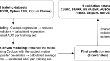 Variables for prediction included demographics: age (continuous), coded sex (categorical: Male, Female, and Unknown), coded race (categorical: White, Black, Asian, Other and Unknown); inpatient-administered and outpatient-prescribed medications (log-transformed counts); and diagnostic codes (log-transformed counts). For log-transformed counts, we identified each diagnostic code and medication. We grouped medications by RxNorm ingredient and each diagnostic code by Clinical Classification Software, Level 2, codes. We then counted occurrences of each group per person in the time before the prediction. The “log-transform” means the counts all were incremented by 1 (to avoid log of zero) and then the natural log of that count +1 value was calculated for all count-based predictors. This common transform has been shown to be helpful in sparse and skewed predictors, i.e., many zero values with few very high counts. Such predictors are common in EHR-based datasets.