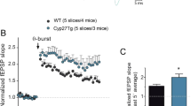 We first studied LTP and LTD in the hippocampal CA3-CA1 Schaffer collateral pathway in WT mice at 8-month-old. LTP is routinely used to study learning and memory in adult mice. Although some previous reports suggested that LTD was difficult to induce using LFS in adult mice [14, 15], successful examples still exist [16, 17]. We were able to induce both LTP and LTD in WT mice at 8-month-old (Fig. 1A).