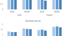 A Logistic regression analysis was performed to investigate the relationship between the DMS and the CA. The scatter plot graph showed a strong positive relationship between the two measures, which was confirmed by Spearman’s correlation coefficients of 0.947 and 0.935 for the males and females, respectively. Logistic regression showed a significant relationship between the DMS and the CA (p < 0.001) for both sexes. The slope coefficients for the DMS were 0.969 and 0.970 for males and females, respectively, indicating that the CA increased by 0.969 and 0.970 years for each extra unit of DMS for males and females, respectively. The R2 values were 0.897 and 0.874, indicating that 89.7 and 87.4% of the variation in CA for males and females, respectively, could be explained by the logistic model containing only the DMS (Fig. 3).