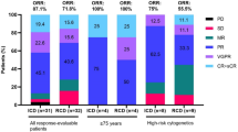 Overall, 37 (77%, 95% CI: 63, 88) patients achieved a confirmed partial response or better across the entire trial, with 35% (95% CI: 22, 50) achieving a VGPR or better. The response rates for the entire study as well as the 45 patients who were enrolled at the MTD are shown in Table 2, including response rates grouped by FISH based risk status. There was increasing depth of response as patients continued to receive additional cycles of therapy as indicated by Fig. 1. Responses occurred rapidly, with the median time to response being 1.9 months (range: 0.9–4.8). Among the 48 patients, the response rate at the end of 4 cycles was 71%. Per protocol, 5 patients went off study for lack of an adequate response by pre-specified time point: MR not seen after 3 cycles (n = 1) and PR not seen after 6 cycles (n = 4).