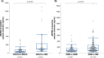 Assessment of the BM plays a key role in differentiating patients presenting with MGUS from SMM and MM and for prognostication in all groups5,6,7,8. The clinical presentations of patients with SMM and MM are variable, with clinical and laboratory signs guiding physicians on the need for more invasive investigation with BM or advanced imaging. However, the prevalence of MGUS increases with age, seen in 8.7% of patients above the age of 80. At presentation, nearly three-quarters of MGUS patients are low-risk or low-intermediate risk, and with increasingly sensitive techniques for screening for MGUS, that proportion will increase. It was our hypothesis (and a part of consensus guidelines13) that performing a BM and advanced imaging in all patients is unnecessary.