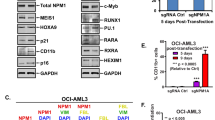 Next, we compared effects of LSD1-KO with those of GFI1 knockout in OCI-AML5 cells. Utilizing two gRNAs designed against exon 2 and 3, CRISPR-Cas9-mediated knockout of GFI1 in OCI-AML5 cells resulted in marked depletion of GFI1, but not of LSD1, with concomitant increase in mRNA expressions of ITGAM, CD86, LY96 and LYZ, as well as increased PU.1, p21 and CD11b protein levels with significant increase in % of cells displaying morphologic differentiation (% increase in myelocytes and metamyelocytes) and expressing CD11b (Fig. 2E–H). Thus, similar to LSD1-KO, GFI1-KO also induced differentiation of AML cells. To compare gene-expression perturbations that accompany differentiation effects due to depletion of LSD1 versus GFI1, we conducted knockdown (KD) of GFI1 and LSD1 with 2 shRNA each, which also exhibited similar effects on differentiation and associated gene expressions in OCI-AML5 (Figs. S3A, B, S4A–F, and data not shown). Following treatment of OCI-AML5 cells with the shRNAs, RNA-Seq analyses showed that considerably greater numbers of mRNA were up or downregulated by LSD1 versus GFI1 shRNAs (Fig. S4G, H). LSD1-KD was associated with global increases in the histone H3K4Me2 and H3K4Me3 levels, as well as increased mRNA expressions of PU.1 and GFI1 targets, along with increased mRNA and/or protein expressions of GFI1, PU.1, p21, p27, CD11b, LY96 and CD86, but depletion of c-Myc (Figs. S4A–F, and S4I). Similar effects following LSD1-KD by shRNAs were also observed in AML MOLM13 cells expressing the MLL-AF9 fusion gene (S4J i–iv. and data not shown). Following KD of GFI1 or LSD1, GSEA of the RNA-seq-determined mRNA expression signatures also demonstrated positive NES for gene-sets including those of interferon α & γ, TNFα, IL2- or IL6-JAK-STAT3/5 and inflammatory pathway, while negative NES were observed for gene-sets including those of oxidative phosphorylation (Fig. S5A). In contrast, negative NESs included those for DNA repair, WNT-β-catenin, MYC and E2F pathway gene-sets, but only in the RNA-Seq signature of LSD1-KD (Fig. S5A). The Venn diagram in Fig. S5B demonstrates considerably more nonoverlapping, up- or downregulated gene-expressions following LSD1-KD, whereas Fig. S5C shows a number of gene expressions that were common and similarly perturbed, including those of known PU.1 targets13,28, following either LSD1 or GFI1 KD. The upregulation of PU.1 targets shown in Figure S5C is likely due to both increased expression of PU.1 and inhibition of GFI1-LSD1 axis. Overall, treatment with LSD1 shRNA induced a higher % of differentiation than GFI1 shRNA in OCI-AML5 cells, as determined by increase in % CD11b expression (LSD1 shRNA: 68.7% versus GFI1 shRNA: 30.4%) and morphologic features of myeloid differentiation (LSD1 shRNA: 71.7% and GFI1 shRNA: 33.9%). This suggests that the amount of differentiation induced by knockdown or knockout of LSD1 or GFI1 in AML cells best correlated with increased expression of PU.1 and p21 but depletion of c-Myc. Notably, 96 h post treatment with shRNA to LSD1 or GFI1, a small (<20%) but similar % of apoptotic OCI-AML5 cells were observed (% annexin V-positive cells).