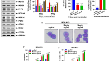 A, B Representative immunoblot analysis of OCI-AML5 Cas9- expressing cells transduced with two lentiviral sgRNAs against LSD1 and incubated for 8 days. C Expression of c-Kit and CD11b (assessed by flow cytometry) in OCI-AML5 Cas9 and LSD1 knockout cells 8 days post-transduction. Mean of two independent experiments performed in duplicate + S.D. Significance determined by a two-tailed, unpaired t-test. D Morphologic differentiation (% myelocytes and metamyelocytes or bands by morphologic features of hematoxylin & eosin-stained cytospun cells) of OCI-AML5 Cas9 and LSD1 knockout cells 8 days post-transduction. Mean of two independent experiments performed in duplicate + S.D. E Representative immunoblot analysis of SET2 cells transfected with two sgRNAs against LSD1 and incubated for 7 days. F, G Induction of morphologic differentiation (% myelocytes and metamyelocytes or bands by morphologic features of hematoxylin & eosin-stained cytospun cells) and apoptosis in SET-2 LSD1 knockout cells 7 days post-transfection. Mean of two independent experiments performed in duplicate + S.D. **p < 0.01, ***p < 0.005 compared to sgNeg-transfected SET-2 cells (determined by a two-tailed, unpaired t-test). H Immunoblot analysis of OCI-AML5/LSD1-FKBP12(F36V) cells treated with 500 nM of dTAG-13 for the indicated times. I OCI-AML5/LSD1-FKBP12(F36V) cells were treated with 500 nM of dTAG-13 for 96 h. At the end of treatment, differentiation was assessed by cell morphology, as described above. Mean of three experiments + S.D. ****p < 0.001 compared to untreated control cells (determined by a two-tailed, unpaired t-test).