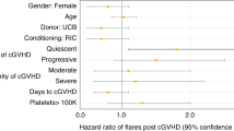 In multivariate regression, we examined the independent impact of clinical factors on the development of TEE using the stated predetermined risk factors (Fig. 2). Higher risk for TEE was associated with cGVHD severity (hazard ratio [HR] 4.9, [95% CI, 1.1–22.0]; p = 0.03), non-O-donor to recipient ABO match compared to O-donor to O-recipient match (HR 2.7, [95% CI, 1.0–7.5]; p = 0.053), and personal history of coronary artery disease (HR 2.4, [95% CI, 1.1–5.3]; p = 0.03). Organ involvement at cGVHD onset (mucocutanous vs. visceral) was not associated with risk of subsequent TEE.