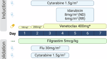 Immunophenotypic evidence of measurable residual disease (MRD) was performed using eight-color flow cytometry. MRD was quantified as percentage of total leukocytes after the exclusion of most red blood cell precursors. At least 200,000 events were acquired to achieve a minimum sensitivity of 10−3–10−4 (0.1–0.01%), as described previously [18]. Next-generation sequencing (NGS) was employed for the assessment of mutations. The assay interrogates the entire exonic or hotspot regions of 81 genes that are frequently mutated in myeloid malignancies, as described previously [19]. A minimum sequencing coverage of x250 was used to reach an analytical sensitivity of 1% mutant reads in a background of wild-type. FLT3 mutation analysis was performed using a multiplex fluorescent-based polymerase chain reaction (PCR) analysis followed by capillary electrophoresis.