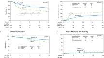 At a median follow-up of 6.83 years (range (0.04–28.52) in the 431 patients achieving CR or PR, the median time to relapse was 12.2 years: particularly, 75%, 53.6%, and 45.4% of patients were expected to be free from relapse at 5, 10, and 15 years, respectively (Fig. 2A). A statistically significant difference in duration of response was identified between patients that obtained a CR compared to patients in PR (19.4 years versus 4.8 years, p < 0.0001) (Fig. 2B). No other differences in RFS were identified, according to the route of administration, detection of BRAF-V600E mutation, calendar decade of treatment, age at treatment start, sex, baseline values of white blood cells, neutrophils, platelets and hemoglobin, and infection at onset, percentage of leukemic infiltration and bone marrow Hairy Cell Index. No differences in depth and duration of response, RFS, infections, bone marrow recovery, and survival were reported among 183 patients receiving subcutaneous administration of 2CDA, compared to intravenous administration.