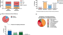 Progression on treatment (either active or maintenance) occurred in 601 patients (41.8%) and influenced the choice of second-line therapy in comparison to patients relapsing while off treatment (n = 838, 58.2%). This includes more frequent use of quadruplets in comparison to patients who relapsed being off treatment (n = 42, 6.9% vs. n = 15, 1.8%; p < 0.001), the use of salvage ASCT (n = 32, 5.3% vs. n = 19, 2.3%; p = 0.002), treatment based on PIs (n = 352, 58.6% vs. n = 365, 43.6%; p < 0.001) or PI + IMID (n = 145, 24.1% vs. n = 128, 15.3%; p < 0.001) and the use of monoclonal antibodies (n = 80, 13.3% vs. n = 45, 5.4%; p < 0.001). Patients who relapsed on active treatment/maintenance were treated less often with an IMID-based regimen (n = 290, 48.3% vs. n = 546, 65.2%; p < 0.001).