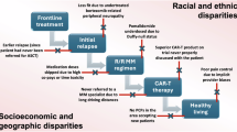 Fifteen US studies and six non-US studies reported on age and disparities in access to treatment (Supplementary Table 3), with the majority showing that increasing age reduced access to treatment, including stem cell transplantation. Twelve US studies (Supplementary Table 4) and one study each in Europe and Canada reported on sex and access to treatment, most identifying better access to treatment in favor of men [31, 39, 40, 42, 43, 47, 54, 65, 80]. Access to stem cell transplantation was also reported to be worse in females [31, 40], except for one US study which reported that more Black women than Black men underwent autologous stem cell transplantation [26] and one Canadian study reporting no significant effect of sex on access to autologous stem cell transplantation [80]. For race/ethnicity and access to treatment, 19 US studies (Supplementary Table 5) and one study each in the United Kingdom and New Zealand were identified. Among the US studies, most reported worse access to treatment for Black [15, 21, 31, 32, 36, 37, 40, 42, 47, 54, 55], Asian [19, 31, 62], and Hispanic patients [15, 22, 31, 55] compared with White patients. In the US studies, there were trends suggesting that Hispanic patients and Black patients were less likely than White patients to receive stem cell transplantation [20, 22, 31, 32, 37, 40, 55] and that Black patients were more likely to experience delay in receiving stem cell transplantation compared with White patients [26]. In addition, one study in New Zealand observed significantly lower uptake of autologous stem cell transplantation in patients with Maori/Pasifika ethnicity compared with European or other ethnicities [66]. Twelve US studies and seven non-US studies reported on socioeconomic status and access to treatment (Supplementary Table 6), with mixed results. Lower socioeconomic status, whether defined by general socioeconomic status, household income, education level, or insurance status, was generally associated with worse access to treatment, including stem cell transplantation[27, 36, 37, 39, 40, 43, 50, 54, 58, 72, 80, 88, 93, 97], although this was not a universal finding [36, 42, 43, 47, 50, 54, 58, 60, 66, 96]. The effects of geography on access to treatment were reported in five US studies (Supplementary Table 7) and one study each in Canada and France [80, 84]. No consistent findings on differences in access to treatment, including stem cell transplantation, with respect to living in rural, urban, or metropolitan areas were found [40, 42, 43, 54, 80].