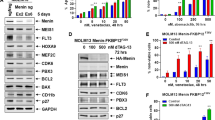 We next conducted ATAC-Seq and RNA-Seq analyses on cells harvested longitudinally from a patient at the RUNX1-FPD versus FPD-MM stage [19]. Figure 1F demonstrates that, compared to RUNX1-FPD, FPD-MM cells exhibited a significant increase in chromatin accessibility. Notably, log2-fold increase in ATAC-Seq peaks was observed at several loci, including MECOM, PIM1, RELB, CDKN1B, CDK6, SPI1, MYB and BCL2 loci, whereas ATAC-Seq peaks declined at the PRDM9, WNT5A, TERT and AF3 loci (Figs. 1G and S1E). RNA-Seq analysis showed significant increase in 404 mRNA expressions and decline in 1305 mRNA expressions in FPD-MM cells, as compared to RUNX1-FPD cells (Fig. S1F). QPCR analysis showed significant increase in BCL2 and MYB but decline in RUNX1 and SPI1 mRNA expressions (Fig. S1G). Notably, ATAC-Seq and RNA-Seq peaks significantly increased at the MECOM locus, involved in AML stem cell renewal and differentiation arrest [20], in FPD-MM compared to RUNX1-FPD cells (Fig. 1H). We next conducted ChIP analysis with anti-H3K27Ac antibody in GMR-AML cells [4, 19]. This demonstrated high occupancy of H3K27Ac at the active super-enhancers of 1478 genes, including those of MYC, RUNX3, MYB, CDKN1B, BCL2 and CDK6 (Fig. 1I) [21]. To assess gene expressions, we performed immunoblot analyses to compare protein expressions in GMR-AML1 cells with germline mtRUNX1 versus OCI-AML5 and OCIAML2 cells, which express somatic heterozygous mtRUNX1 and two copies of wtRUNX1 [12], respectively, as well as versus CD34+ normal hematopoietic progenitor cells. Figure 1J demonstrates that, compared to normal CD34+ progenitor cells, GMR-AML1 cells expressed higher levels of c-Myb, EVI1, c-Myc, polo-like kinase 1 (PLK1), NOTCH1, BCL2, BcL-xL, MCL1, BAX and BAK. However, compared to OCI-AML5, GMR-AML1 cells expressed lower levels of c-Myb, c-Myc and BCL2 (Fig. 1J). These findings highlight the increased activity of chromatin and increased expression of specific oncoproteins that are associated with arrested differentiation, increased in vitro growth and in vivo leukemogenic potential of GMR-AML1 cells.