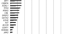 A total of 735 somatic mutations were identified at diagnosis in 181 patients. The median number of gene mutations was 4 (range 1–10). Four potential germline mutations (in CEBPA, NF1, DDX41, and RUNX1) were excluded from all analyses. Twenty-three VUS with persistence at a high level in CR were identified. As patients with only VUS persistence in CR1 had the same prognosis as negative MRD patients (not shown), VUS were excluded from further analyses. Detailed mutational data at diagnosis and CR1 are described in Fig. 2, supplementary Fig. 1, and Supplementary Table 4. The most frequently mutated genes detected were FLT3 (n = 56 ITDs and n = 52 other mutations), NPM1 (n = 67), NRAS (n = 57), DNMT3A (n = 50), and TET2 (n = 45).