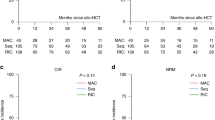 Randomized comparisons between MAC and RIC of the BMT–CTN trial were published previously [11, 12]. Here, at 4 years, the NRM was 25.1% for MAC, compared with 9.9% for RIC (p < 0.001), but patients who received RIC had a significantly higher risk of relapse (60.7% vs. 19.8%; [HR], 4.06; 95% CI: 2.59–6.35; p < 0.001). OS was superior for patients who received MAC compared to those who received RIC (HR, 1.54; 95% CI: 1.07–2.2; p = 0.03), but OS in only MDS patients was 70.2% (95% CI: 51.8–85.7%) for MAC versus 58.3% (95% CI: 39.2–76.2%) for RIC and not statistically significantly different (p = 0.366). There are several differences between this analysis and our clinical trial. Scott et al. analyzed patients with AML (n = 218) and MDS (n = 54) in contrast to 125 patients with MDS (including 12 patients with AML) in our study. Furthermore, different conditioning regimens were allowed (RIC: FLU + BU2 or Melphalan; MAC: BU4/CY or FLU+Bu4 or Cy+TBI 12 or 14.2 Gy), and a variety of GVHD regimens and ATG were allowed as decided by each center. In our trial, uniform conditioning of BU4/CY for MAC and FLU/BU2 for RIC and the same GVHD prophylaxis was used. Median follow-up was 75 vs. 51 months. In agreement with the Scott study, OS (primary endpoint in both studies) and RFS of MDS patients were not different in the two studies.