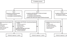 Between 22 December 2016 and 10 May 2019, 36 patients were enrolled, and 35 patients were treated at doses ranging from 50 mg to 205 mg corresponding with a range of 0.6–2.0 mg/kg. After a dose-limiting toxicity of fatigue was observed in one subject in cohort 1A-2 (100 mg), a decision was made to change the dosing regimen to weight-based dosing due to a wide range of exposure and assumed narrow therapeutic range. Dose escalation continued with mg/kg-based dosing up to the level of 2 mg/kg. This dose level was determined to be the MTD based upon observed adverse events, although further DLTs were not observed. The demographic information is shown in Table 1. Of the 35 treated patients, 12 (34%) had castrate-resistant prostate cancer (CRPC), 5 (14%) had melanoma, 4 (11%) had NMC, 4 (11%) had oestrogen receptor positive breast cancer (ER + BC) and 10 (29%) had other tumour types. Median age was 60 years (range 17–78 years). Treatment discontinuation occurred due to disease progression in 28 (80%) patients, due to AEs in 5 (14%) patients and 2 (6%) for other reasons.