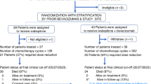 One bowel perforation occurred in our study [56,57,58]. While more patients experienced peripheral neurologic and musculoskeletal toxicity in the IXA + BEV arm, we did not control for cumulative prior toxicities. Due to prolonged clinical benefit, the IXA-BEV group received more than double the number of infusions (Fig. 1). Sensory neuropathy was also greater in the chemotherapy+BEV arm of AURELIA [4]; some [59] have suggested a class effect in which VEGF inhibition hinders the regeneration of neurons.