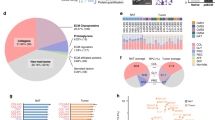 Of note, ~3% of (epithelial) tumour cells showed atypical expression of FAP (Fig. 3a, b and Supplementary Fig. S3B). This could reflect the presence of mesenchymal-like tumour cells, resulting from a (partial) EMT. Indeed, we found that an epithelial differentiation signature [26] was inversely correlated with FAP expression in individual tumour cells (Supplementary Fig. S3C). Interestingly, the vast majority of FAP-expressing tumour cells were derived from a tumour (SMC20) that was classified as CMS4 (Supplementary Fig. S3A, B). Differential gene expression analysis of FAP-positive and FAP-negative tumour cells in patient SMC20 identified 388 genes that were significantly upregulated in FAP-expressing tumour cells. Functional analysis of this geneset revealed an enrichment of genes involved in RNA splicing and protein translation, oxidative phosphorylation, and the cellular response to stress (Supplementary Fig. S4A and Supplementary Table S3). The latter group includes key genes involved in the protection of tumour cells against reactive oxygen species (GPX2, SOD1, PRDX1), a phenotype that we have previously linked to CMS4 CRC [29, 30]. Conversely, FAP-positive tumour cells expressed significantly lower levels of genes encoding epithelial junction proteins (including CDH1, JUP, CTNN1A) epithelial differentiation markers, including several keratins (6B, 7, 17, 19, 23) and mucins (1, 3A, 4, 12), and chemokines (CXCL1-3, 5, 6) (Supplementary Fig. S4B and Supplementary Table S3). Together the data indicate partial loss of epithelial identity and cell-cell contact in FAP-expressing tumour cells, but no clear gain in expression of mesenchymal genes, which is in line with a ‘partial EMT’ [31].