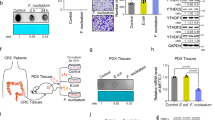 For the xenograft experiments, 4–5-week-old male Balb/c nude mice were purchased from the Shanghai Model Organisms Center (Shanghai, China) and housed in specific pathogen-free (SPF) conditions. HCT 116 cells (5 × 106 or 2.5 × 106) with different treatments were suspended in 100 μl of phosphate-buffered saline (PBS) and inoculated subcutaneously into the right axilla of the mice to establish the CRC xenograft model. Six days after subcutaneous injection, mice with xenograft tumors and no significant differences in tumor load were divided into different groups (n = 5). F. nucleatum (MOI = 100, 100 μl per mouse) were given by multipoint intratumoral injection, twice per week for 2 weeks. Metformin (125 mg/Kg) was administered via gavage every day for two weeks. Chemotherapeutic agents (FOX: 5-Fu 5 mg/Kg + Oxaliplatin 6 mg/Kg) were administered by intraperitoneal injection, twice per week for 2 weeks.