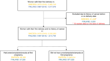 Through linkage of nationwide registry data, we followed 3,303,880 initially nulliparous women in Denmark (1994–2014), Finland (1990–2014), Norway (1984–2015) and Sweden (1985–2015) from first pregnancy ≥22 weeks to ovarian cancer, emigration, death or end of follow-up (2014/2015). We estimated hazard ratios (HRs), adjusting for age, parity, maternal birth year and country, and for body mass index and smoking in subsamples.