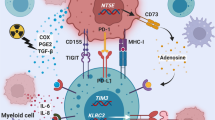 Unsupervised clustering was used to explore the flow cytometry data [35]. Thereby, NK-92/5.28.z and checkpoint inhibitor monotherapies as well as the combination therapy showed reduced levels of regulatory CD8+ T cells. The most abundant cluster in Phenograph analysis revealed an expression profile characteristic for CD4+ NKT cells. NKT cells are CD4+ T cells co-expressing NK-cell specific markers like NK1.1 or its human homolog CD161. In contrast to T cells, NKT cells are CD1d restricted [53, 54]. CD1d is a class Ib MHC-like protein, which presents lipid antigens instead of peptide epitopes. Lipids presented by CD1d are recognized by a specific type of αβ T-cell receptors (TCRαβ) with very limited variety. Generally, NKT cells can be divided into type I and II NKT cells. Type I NKT cells, also known as invariant NKT cells (iNKT), express a specific TCRα chain (gene segments Vα14Jα18) and only few different TCRβ chains (variable gene segments Vβ2, 7 and 8). Unlike conventional T cells which are restricted to specific peptide antigen structures, NKT cells can recognize a broad variety of lipid antigen structures. Typically, type I NKT cells recognize glycosphingolipids or phospholipids (e.g., α-galactosylceramide (α-GalCer)) [53]. The role of iNKT cells is linked to an increased anti-tumor immune response through production of IFNγ or IL-12. This is mediated via direct killing through NKG2D and the CD1d-TCR interaction. Further, CD1d-TCR interaction can induce DC activation, M1 polarization of macrophages and terminal differentiation of MDSCs [53]. In contrast, type II NKT cells rather mediate immunomodulatory and anti-inflammatory responses of other immune cells through secretion of several anti-inflammatory cytokines [55]. According to our data, it appears likely that type I NKT cells are attracted to the tumor site in mice treated with NK-92/5.28.z in combination with anti-PD-1 checkpoint blockade. Thereby, we detected highly increased levels of CD4+NK1.1+ double-positive cells only in mice treated with combination therapy, while levels of infiltrating CD4+NK1.1+ cells were comparably low in animals of the monotherapy and the control cohorts.