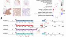 Expression level of 110 genes were evaluated in the discovery cohort using a qPCR microfluidic array. No differences were detected among the control samples, suggesting that the RNA processing machineries under study are stable in healthy tissue. Regarding the LG and HG samples, while marked differences in the expression of several genes were observed with respect to the controls, we only detected minimal variances between the LG and HG, and therefore we decided to consider the 18 PMP samples as a joint group henceforth (Fig. S1). Close analysis of results revealed notable differences between the expression of these machineries’ components in the control and PMP samples, suggesting a dysregulation of these genes at the RNA level. Specifically, 24.19% of studied genes were significantly altered (Fig. 1A), which allowed to cluster samples in distinct groups (Fig. 1B). Furthermore, PLS-DA demonstrated that dysregulated RNA-related gene expression can distinguish between most of the control and PMP samples (Fig. 1B). The splicing-related genes HNRNPK, RAVER1, MBNL1, RNU6ATAC and PTBP1 contributed the most to the discrimination model according to the Variable Importance in Projection (VIP) Score analysis (VIP-Score > 1.5). Splicing-related genes were the highest altered between control and PMP (24.19%), highlighting that most of them were downregulated in the tumor, except for two that were upregulated: PTBP1 and RAVER1 (Fig. 1A). Most of the altered genes were splicing factors, but it was also striking the contribution to this dysregulation of some of the RNUs core of the major spliceosome (RNU6) and, specially, the minor spliceosome (RNU4ATAC, RNU6ATAC), which catalyzes the splicing of less than the 1% of human introns [26]. 18.52% genes were found altered in the RNA exosome complex, all of them downregulated in PMP; and 23.81% of NMD genes were dysregulated, only one of them upregulated, SMG9, and the rest downregulated, in line with what was observed in the other machineries. The disruption in the expression of splicing machinery, RNA exosome and NMD components was corroborated in the two external RNA-seq validation cohorts analyzed (Fig. S2, Fig. S3A), in which not only downregulation of HNRNPK, MBNL1, NOVA1 and RNU4ATAC (splicing machinery), C1D (RNA exosome) and ETF1 (NMD) were confirmed, but also other alterations were uncovered. It is worth noting that the results from the FFPE RNA-seq were more similar to those obtained in our discovery cohort than the ones from the fresh frozen samples RNA-seq, probably due to the more comparable composition of the type of samples (LG and HG PMP). Of note, also, only 3 genes were differentially expressed among PMP grades, the splicing factors HNRNPK, MBNL1 and RBMX, whose expression was decreased in HG (Fig. S3B). Proteomic data analysis only pointed to 2 statistically significant alterations: overexpression of the splicing factor HNRNPA1 and the NMD component ALYREF in PMP (Fig. S4A). Nevertheless, comparison of PMP with different grades also revealed that HNRNPK splicing factor tended to be downregulated in LG and PTBP1 was overexpressed in HG compared to control samples, while RBMX expression was decreased in HG as compared to LG (Fig. S4B). It is worth to highlight the difficulty of a proteomic study in this mucinous tumor, which makes it extremely hard to identify proteins expressed at low levels. In fact, only 1025 proteins were found in PMP, with only 8 of them belonging to the splicing machinery, 1 to the RNA exosome complex and 1 to the NMD, and therefore it was not feasible to perform a standard validation of the differences found at the RNA levels of the rest of the proteins of interest (Fig. S4).