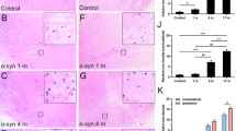 alpha-Synuclein PFF have been generated from human alpha-synuclein monomer in assembly buffer (PBS, pH 7.0) as previously described [34, 37, 81]. Briefly, 4 mg of monomeric α-syn were shacked at 1000 rpm for 7 days at 37 °C. Fibrils were then aliquoted and stored at −80 °C in single use vials. The efficiency of the fibrillation reaction was verified with a Thioflavin T (25 µM, Sigma, T 3516) fluorimeter.